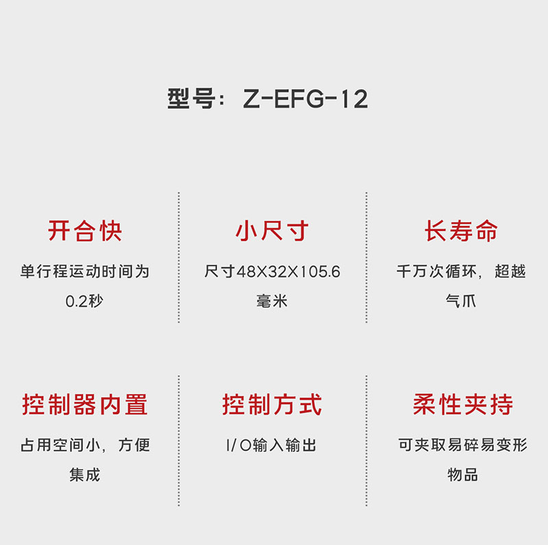 慧靈HITBOT,電動夾爪Z-EFG-12,單行程僅0.2秒,控制器內置何柔性夾持,支持快速夾取易碎物品的功能,可以適應更多的工作場景!